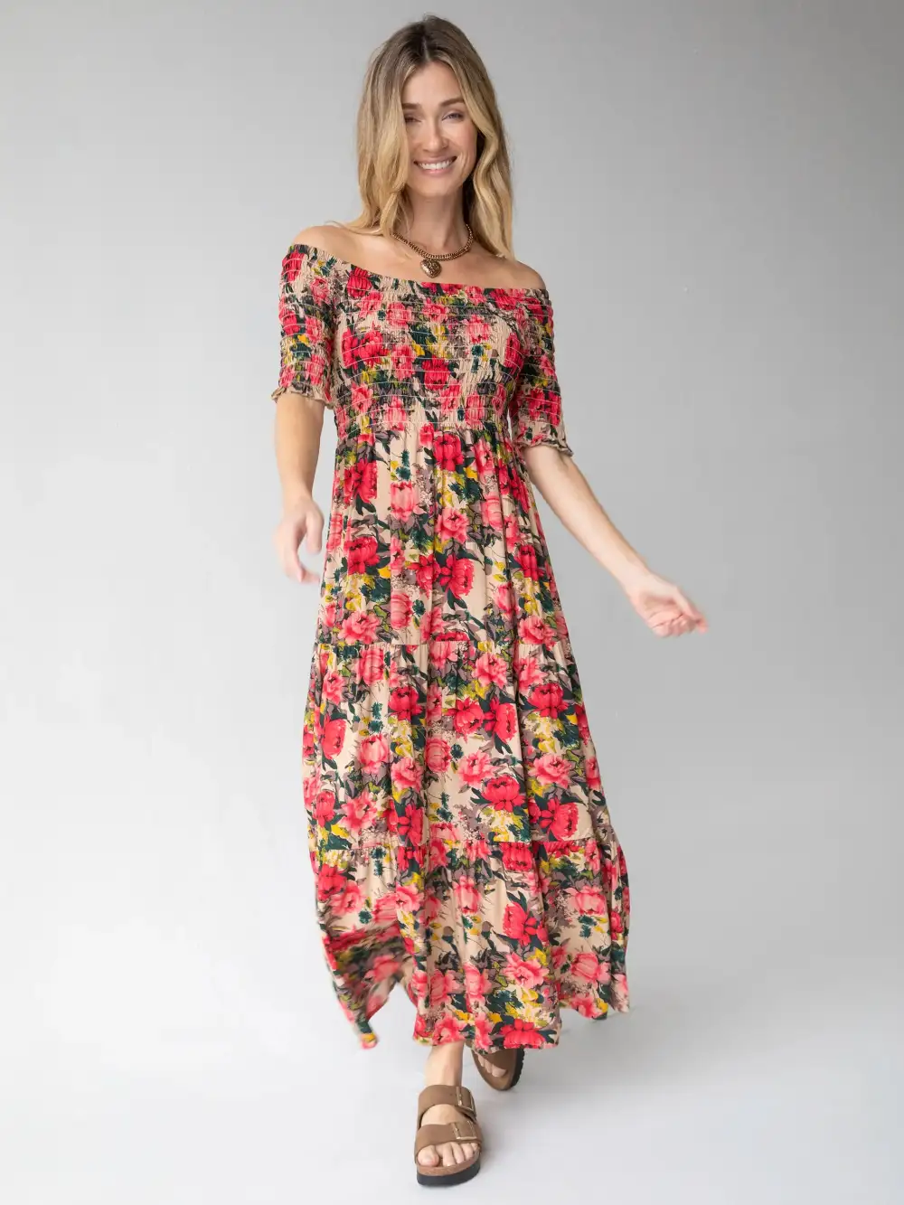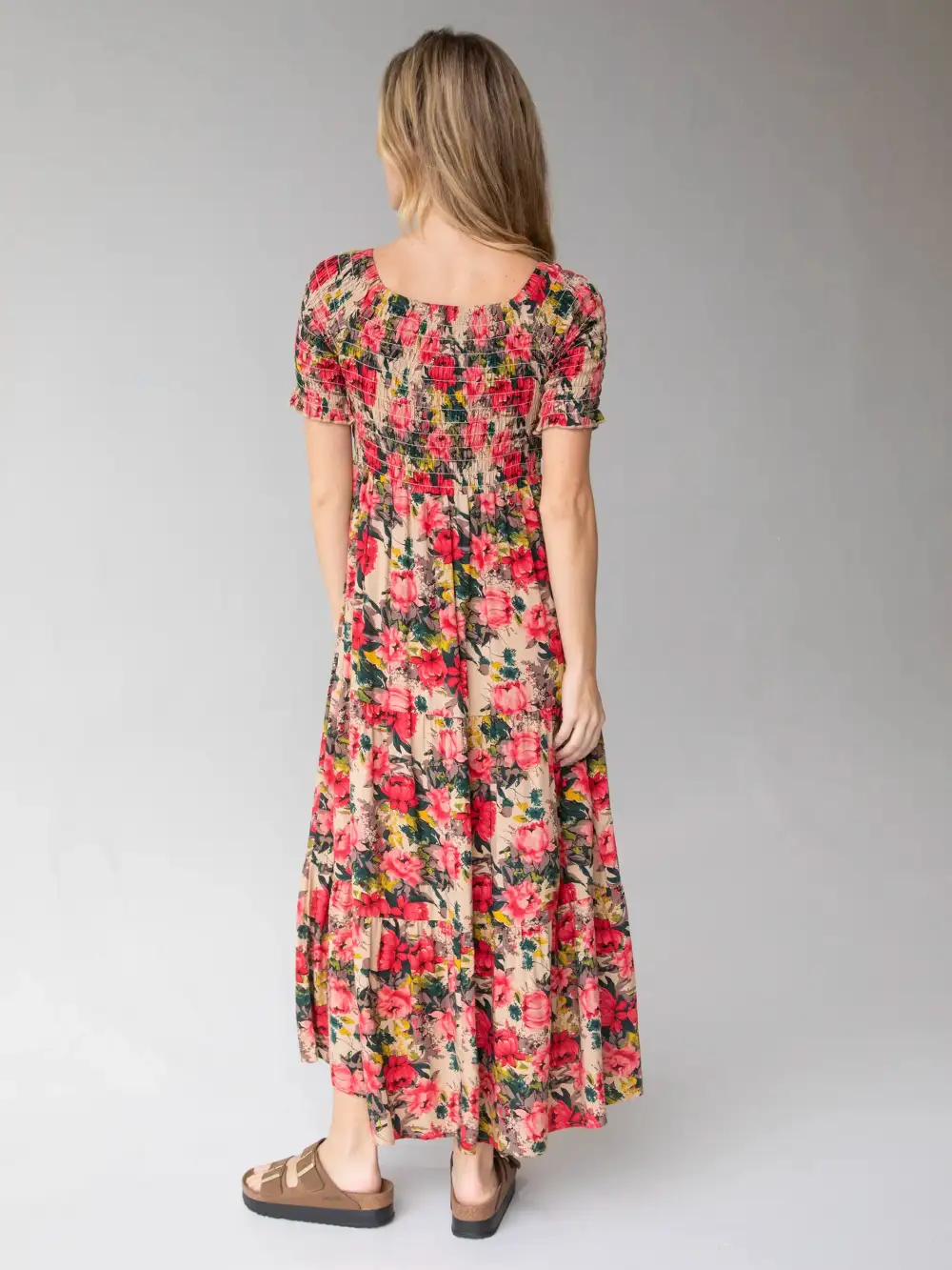 Daisy Tiered Maxi Dress - Tan Red Roses