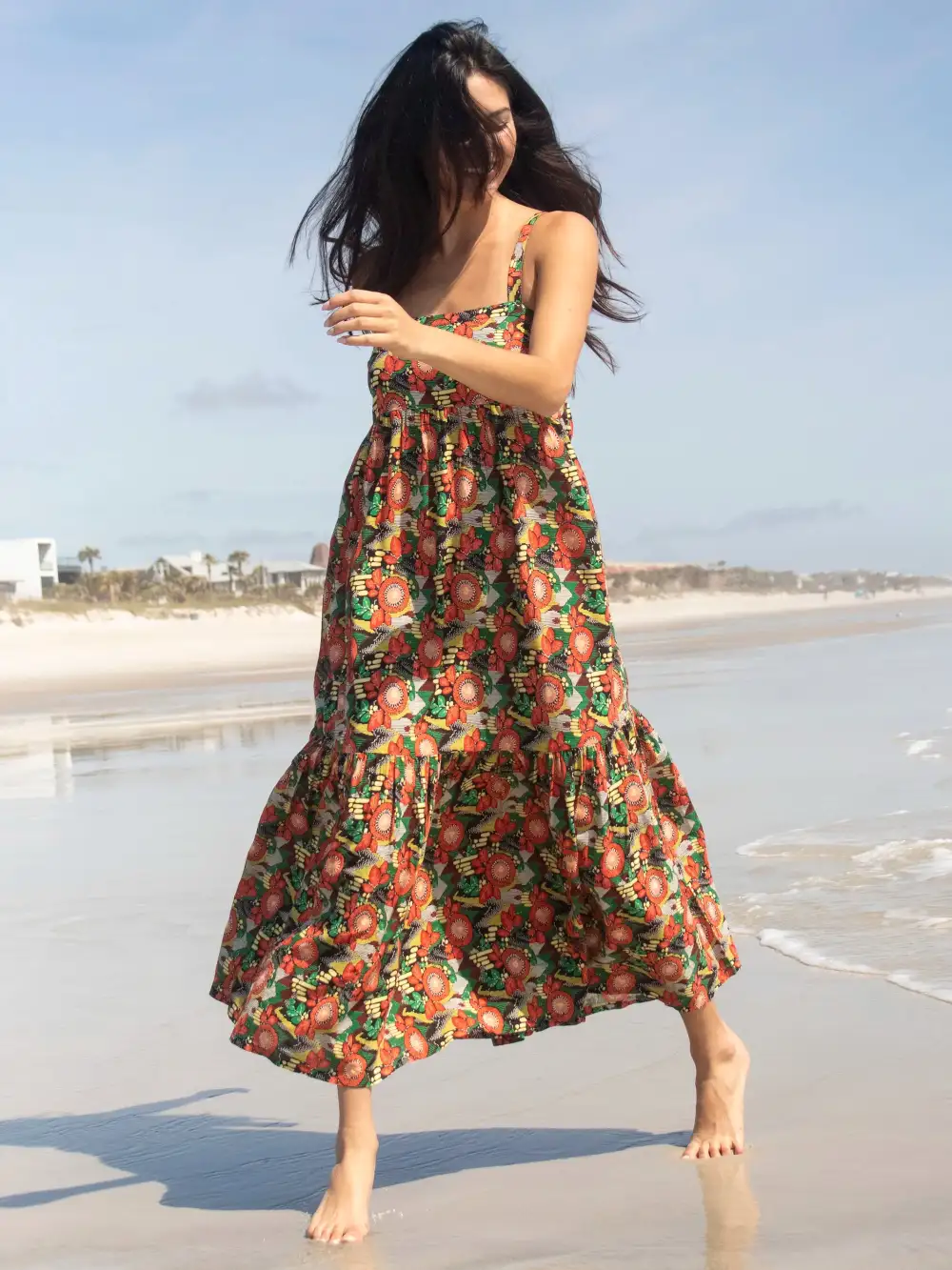 The tie-back detail and vibrant print! A beautiful, flowy dress that's so easy to wear!