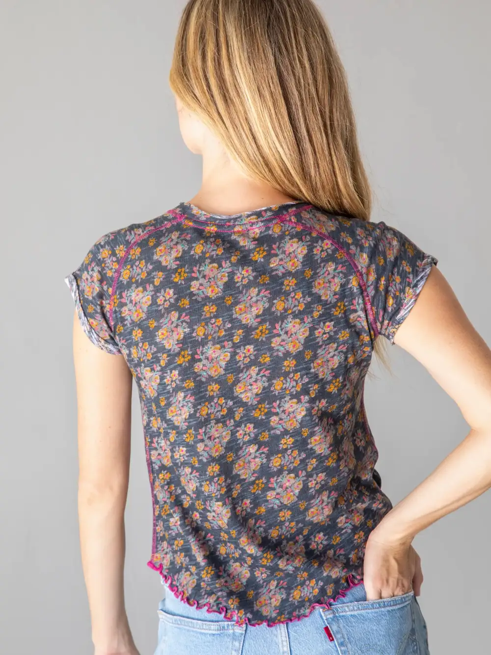 Lily Cotton Short Sleeve Tee Shirt - Slate Floral Blooms
