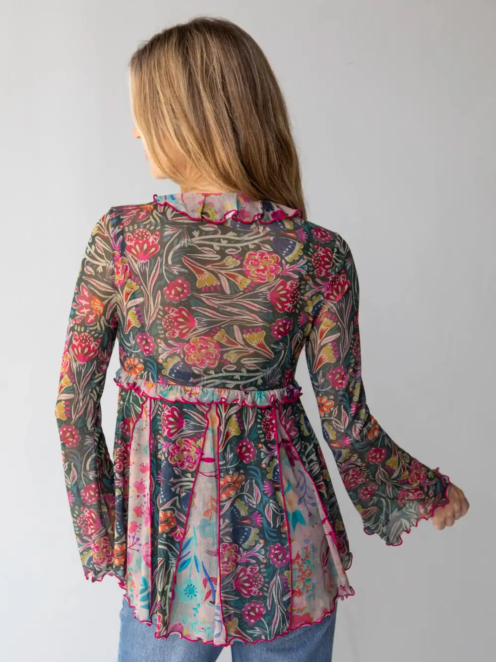 Sierra Ruffle Mesh Top - Green Painterly Vines
