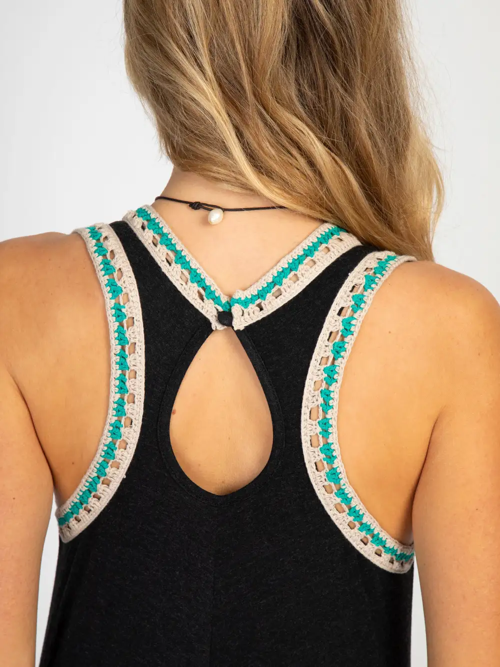 The flattering, swingy fit! The hand-crocheted trim and so soft knit fabric!