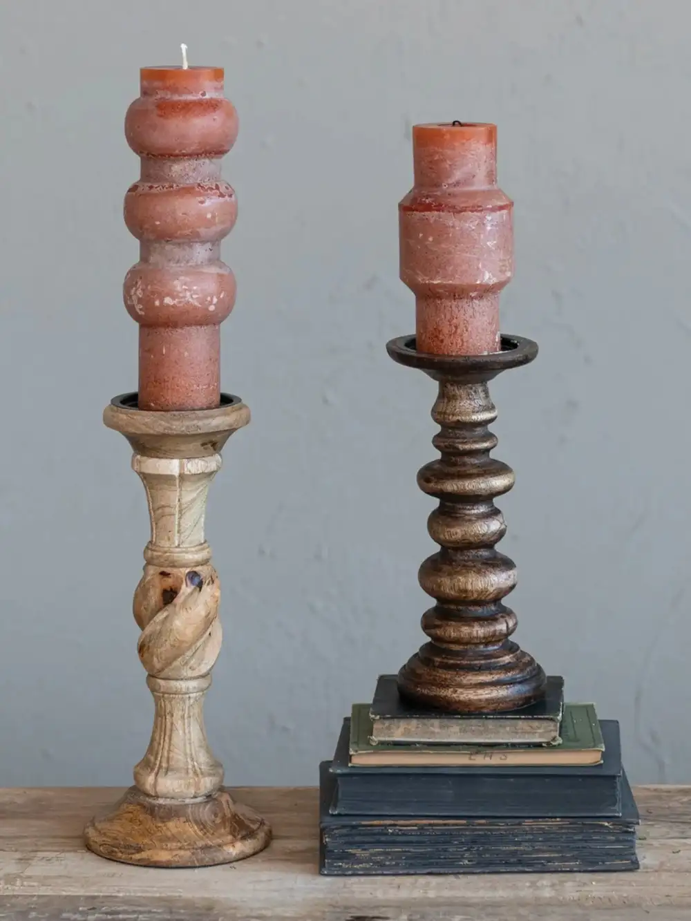 The hand-carved mango wood is full of rustic, natural charm! We LOVE styling them on indoor and outdoor dining tables. They look so pretty on a fireplace mantel too!