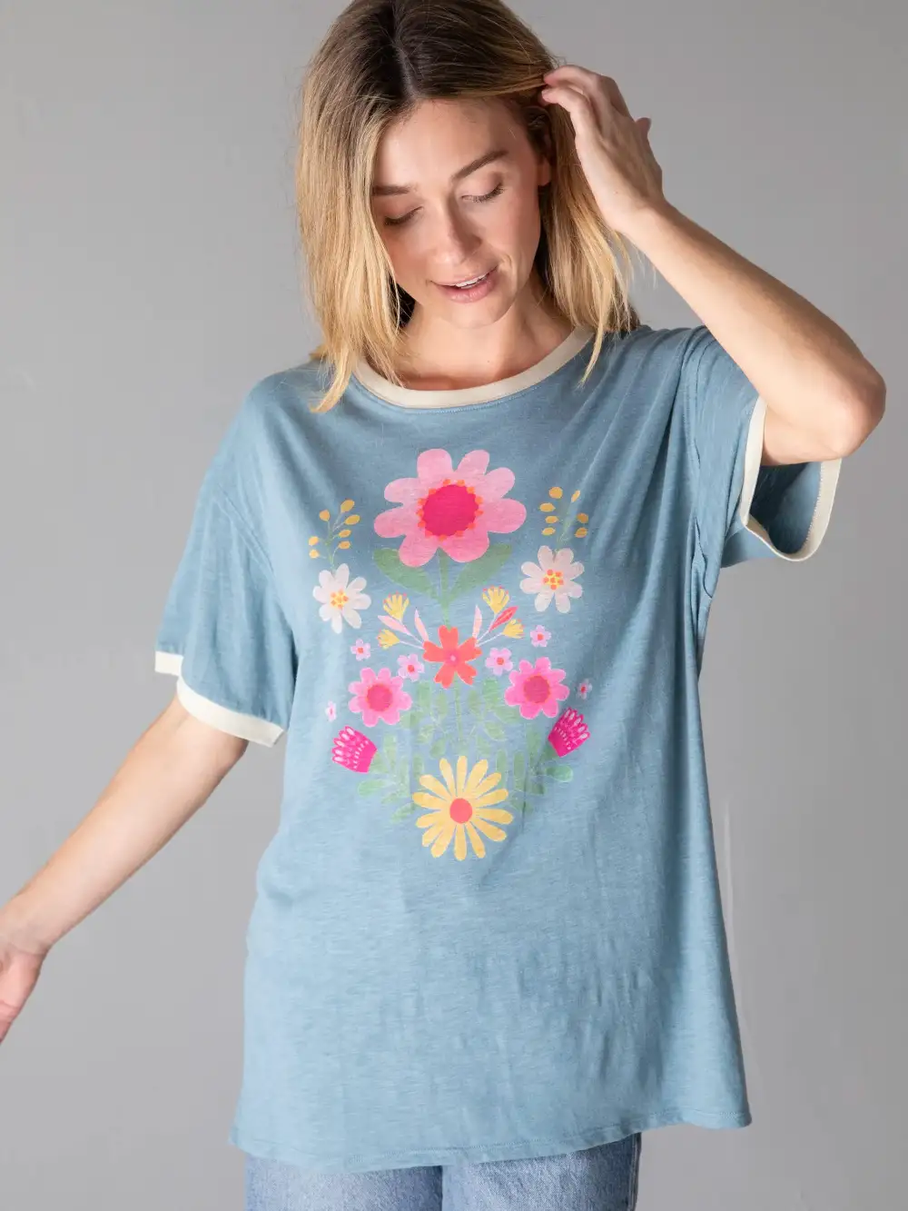 Ringer Oversized Tee Shirt - Blue Folk Flower