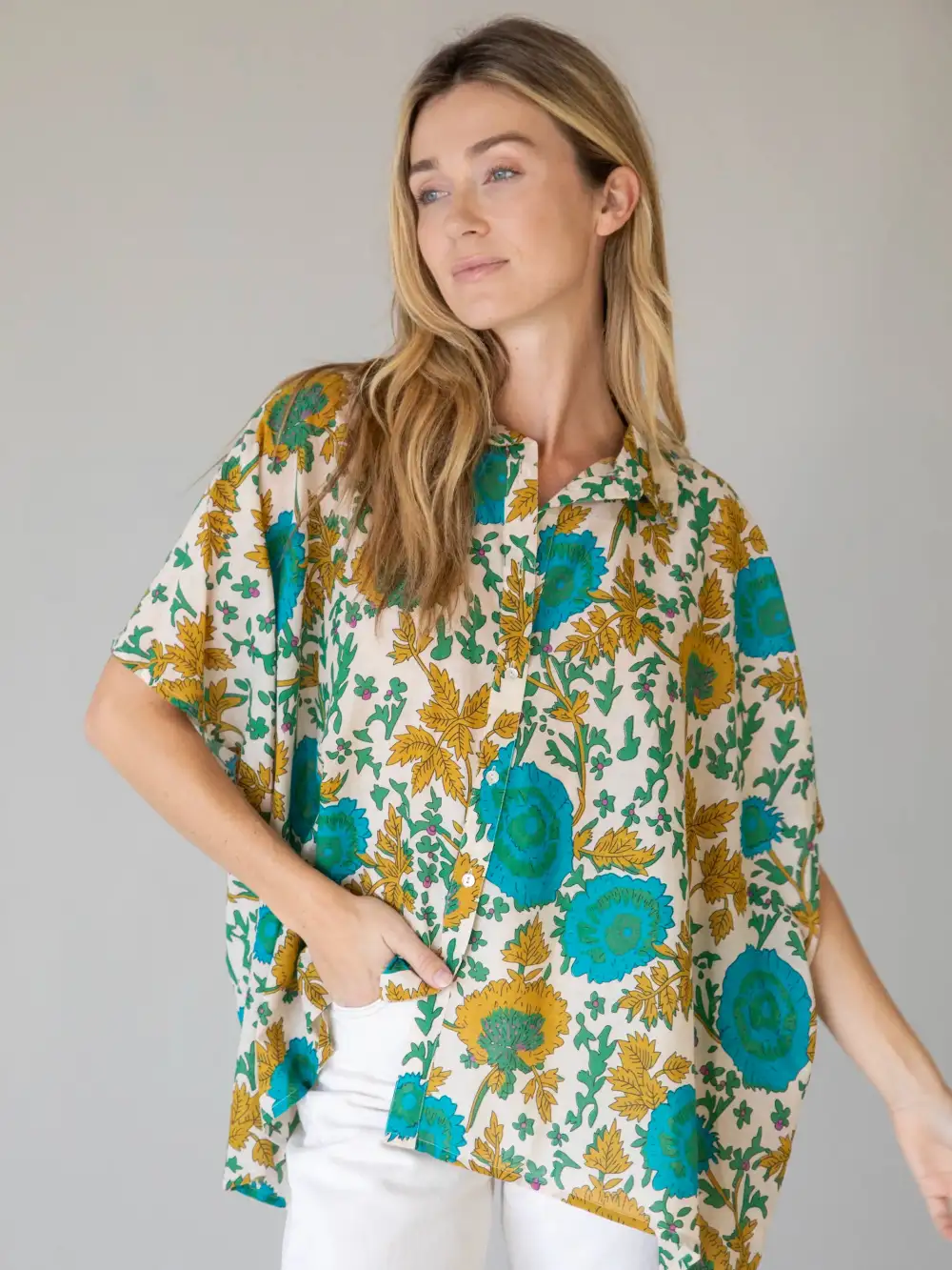 • Kelly Oversized Cotton Button Down - Ochre Leafy Floral