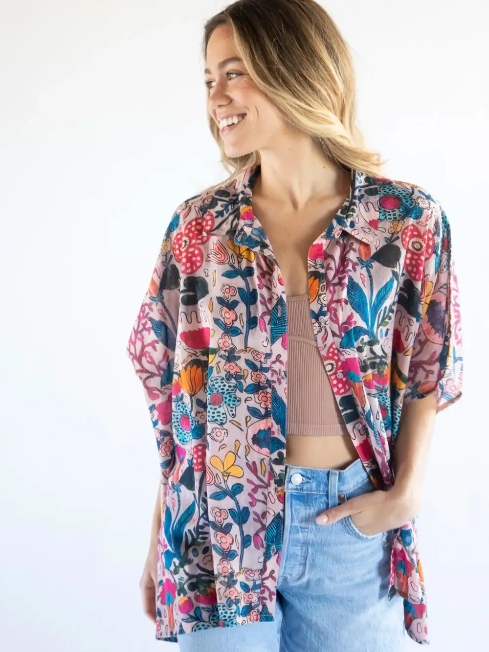 Kelly Oversized Cotton Button Down - Pink Flung Floral