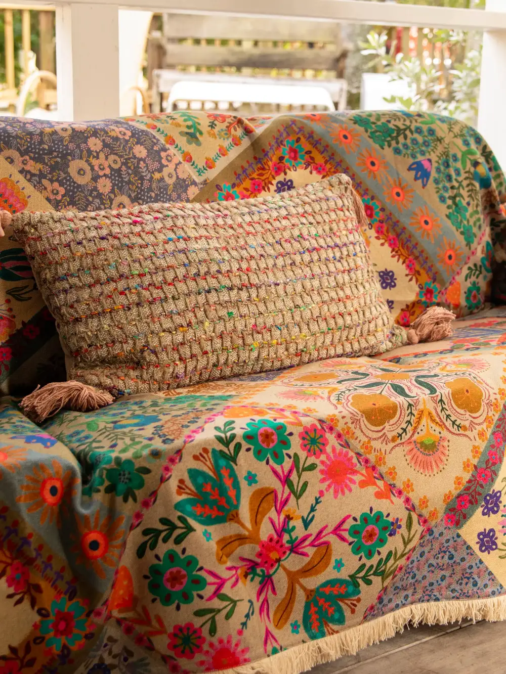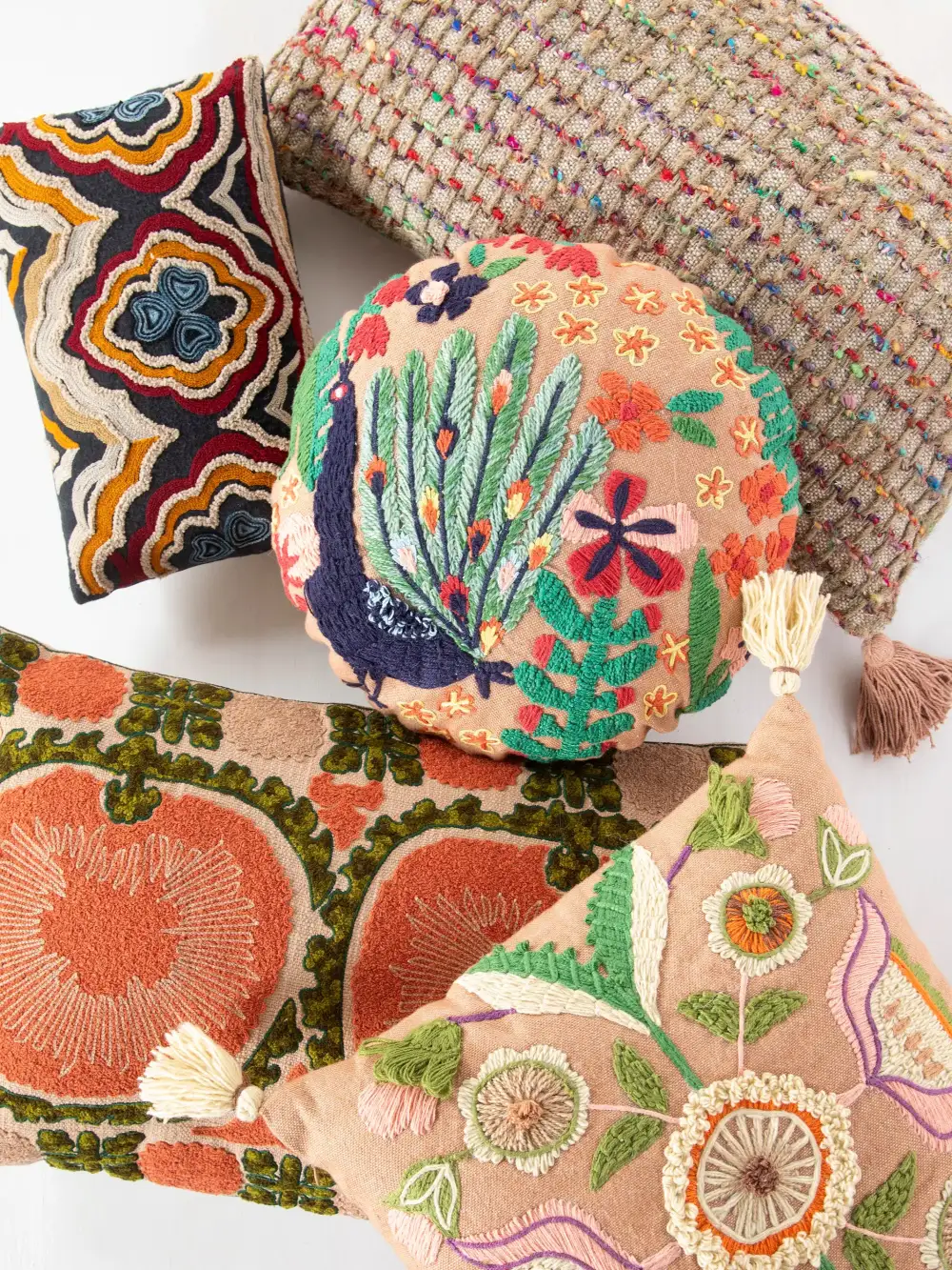 The intricately woven, colorful cotton! Looks beautiful layered on your living room couch!